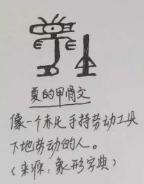 ”,结合夏人在商代的统治下演变成了被统治氏族,是生产者,在“日”下劳动的“”,手持工具的“”,都可以解释成“