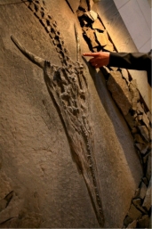 1996 年出土于贵州省安顺市关岭县新铺乡的“新中国龙”化石,龙首上有对称的一对“龙角”,与神话中的龙非常相似,该化石总长七点六米,五爪,龙角从头部的最宽处左右两边长出,双角对称,长约二十七厘米,略显弧形,这对“龙角”在龙头上翘出,酷似传说中龙的形象,为古代传说中长角的神龙提供了实物佐证,为龙的形象起源研究提供了新的思路,有重大的科学和历史价值。
