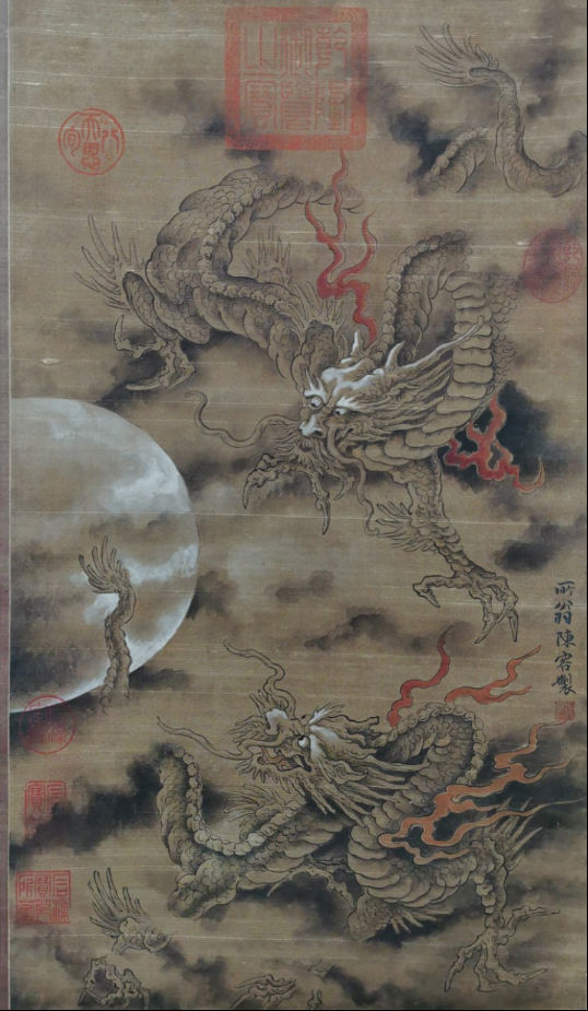陈荣还画过一幅《九龙图》,不过民国时期流失到海外,如今被波士顿美术馆收藏。画面上,九条龙形态各异。一龙两爪紧攀岩石;二龙双目斜视;三龙怒视前方,双目炯炯有神;四龙和巨浪作斗争;五龙和六龙双龙缠绕,似有对决之意;七龙隐于水天一色中;八龙穿雾而出;九龙卧憩于石上。整幅画作既有粗线条的勾勒,也有细节处的雕琢,虚实相生,浓淡相宜。后来有专家把这九条龙解释为天、地、水、火、福、禄、寿、喜、财,足以见这幅《九龙图》的文化寓意之深厚。乾隆皇帝甚至曾亲自为陈荣的这幅《九龙图》题诗:奇笔惊看陈所翁,画龙性讶与龙通,劈开硖石倒流水,喷出湫云浮御空……