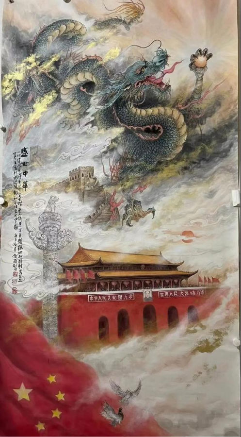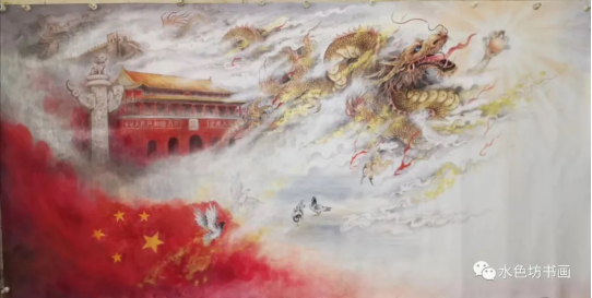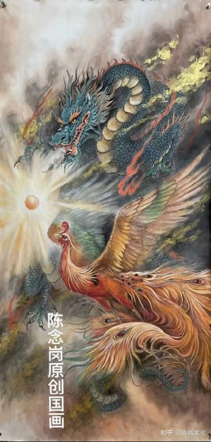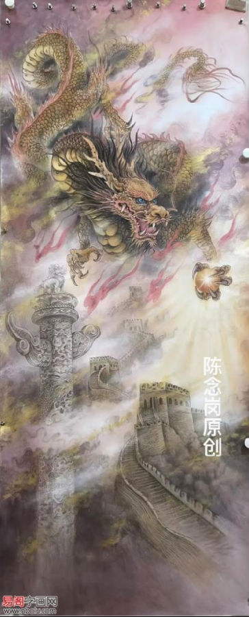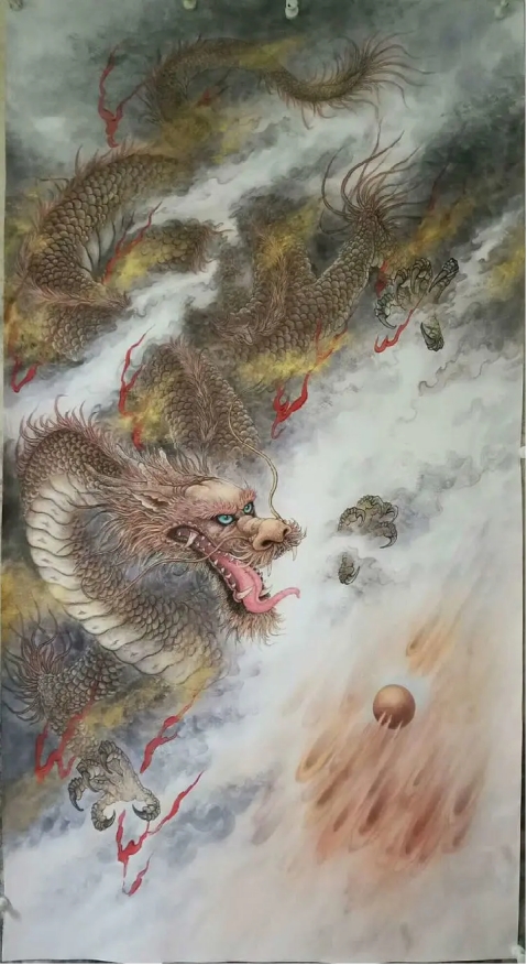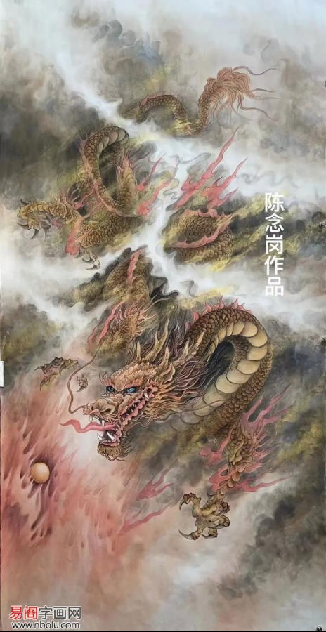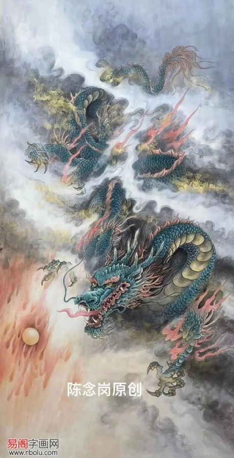 陈念岗笔下的威武的龙,多呈现空中风行的姿态,张牙舞爪,怒目圆睁,庄严肃穆,审视一切,有一种掌控一切的架势,充满了威武霸气之感,令人望而生畏。龙在云海翻腾,昂首吐气,龙行龘龘,雄壮之姿尽显,如何庄严威武,精神焕发的神龙,让人无比地尊崇和崇拜。