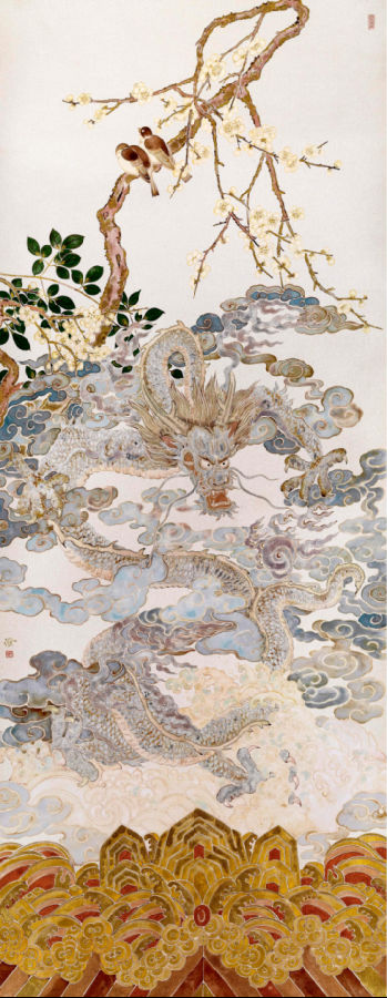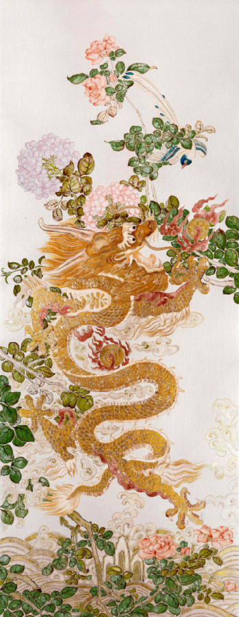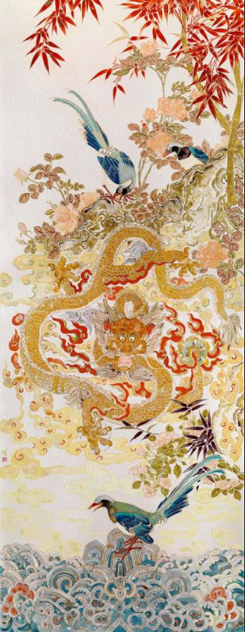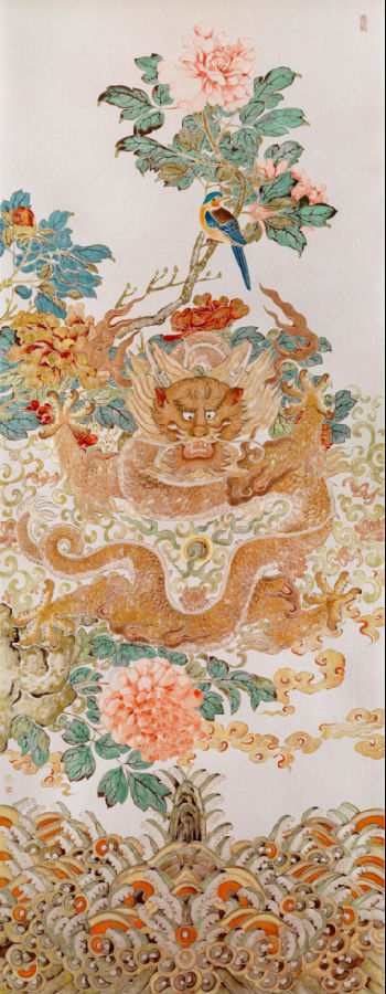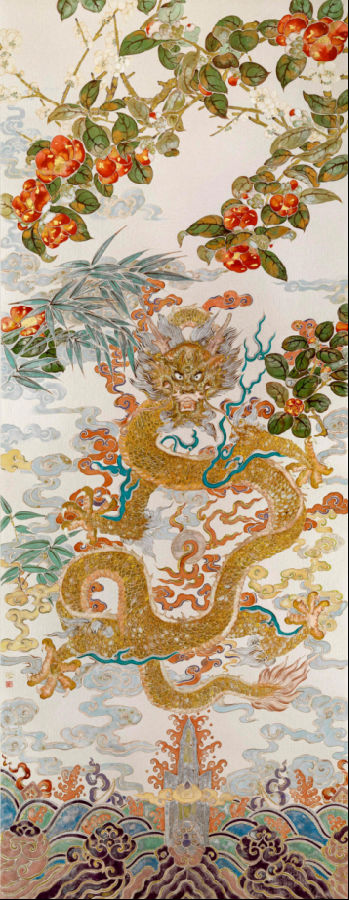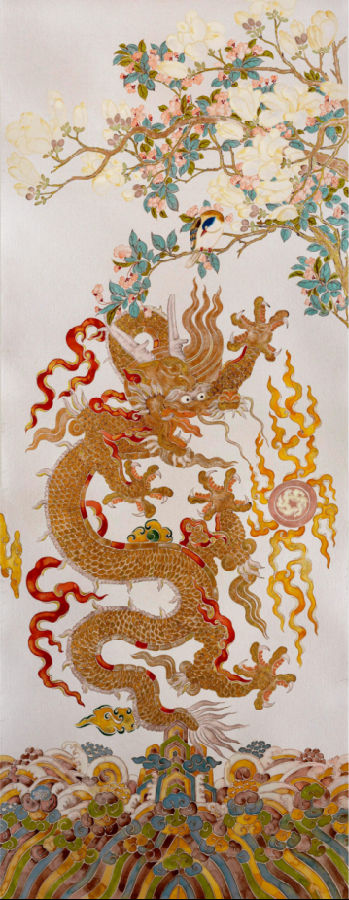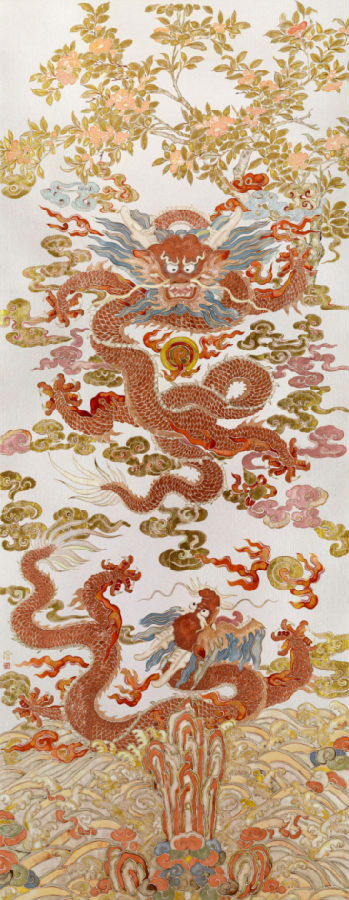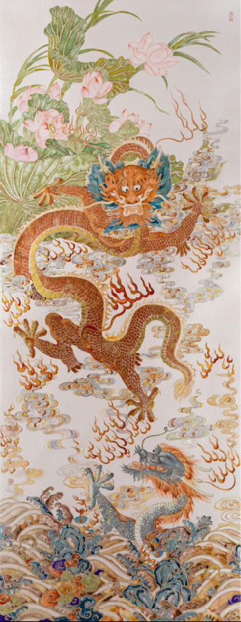 另一幅《双龙戏火珠图》,双龙于图中呈上下对角排列之状,身形皆作赤色,上为降龙,下为升龙,面前各有一火珠,赤焰飞腾、炽热无比,双龙则摇首摆尾、其口大张,似欲将火珠吞纳入口……二者于揖让之间顾盼生情、上下呼应,寓有雌雄双龙情深意切、永相守护之美好爱情寓意,亦有迎春纳福之意,蕴藏喜庆丰收、祈盼吉祥之良好祝愿在焉。此类“控搏骊珠争照耀”之双龙戏珠图形,实则起源于先秦时期,历时三千余年,迄今已衍生演化为代表吉祥喜庆之装饰图纹。