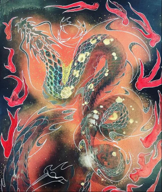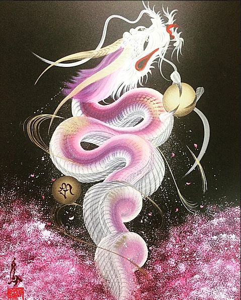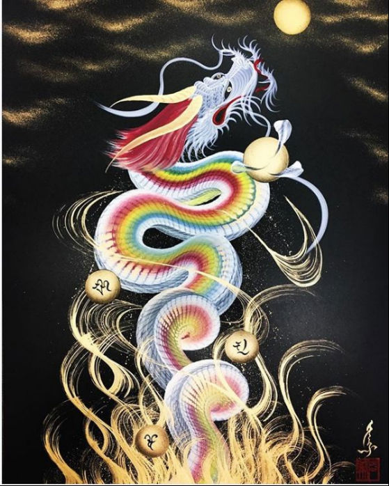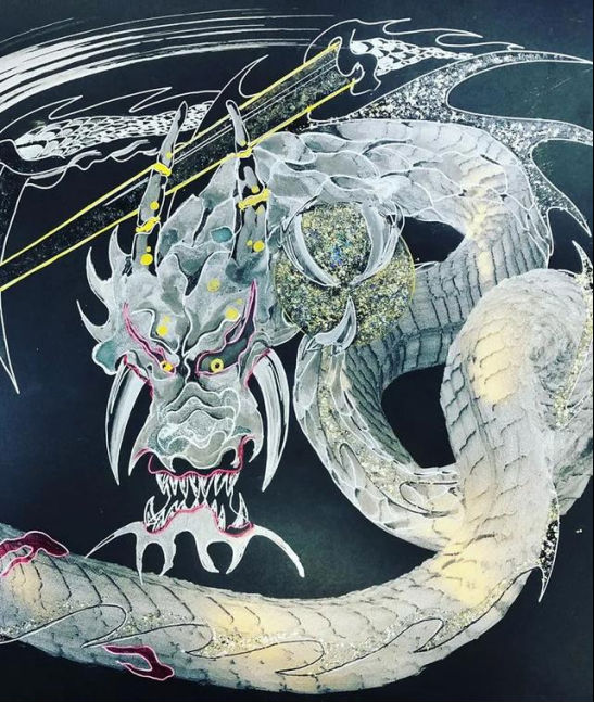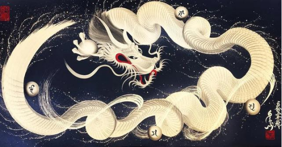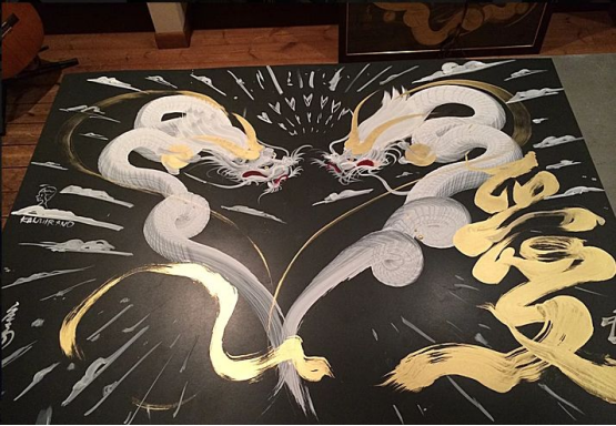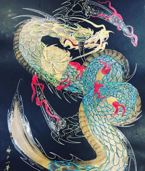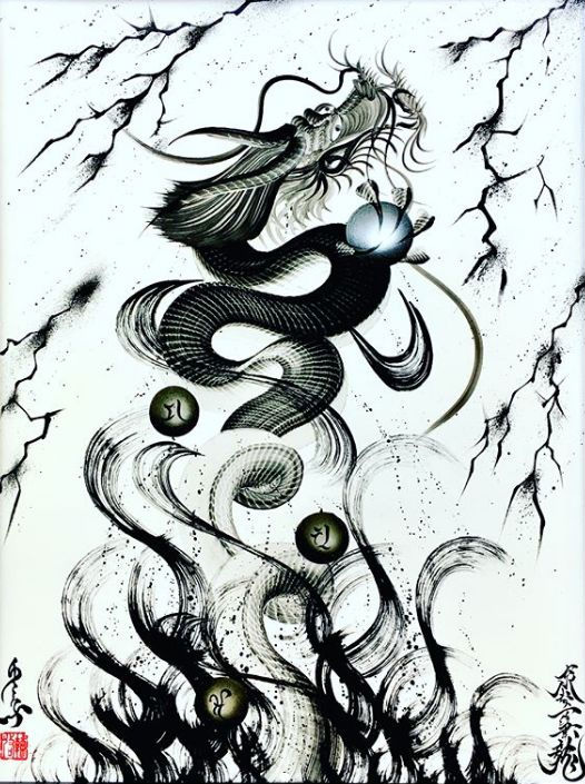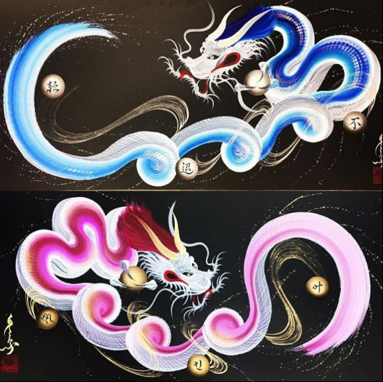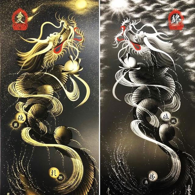 日本艺术家手岛启辅的一笔龙非常出名,他以前是佛坛具的修复职人,因为对龙的喜爱和憧憬之情开始了一笔龙的创作之路。只需要一笔就能画出整幅龙的大部分,龙头部分完成后他就会全神贯注于画龙的身体,利用控制力道的转换,让龙的形体和龙鳞更加徐徐如生。整幅图完成后十分壮观。
