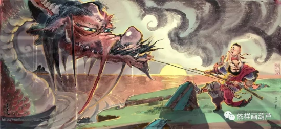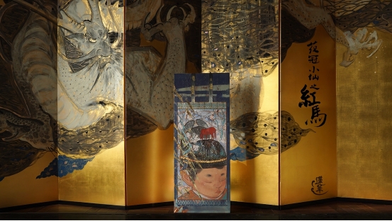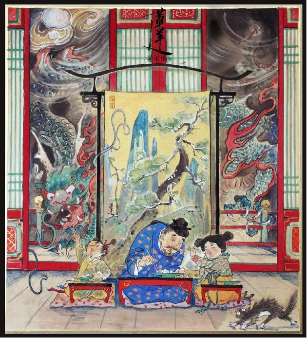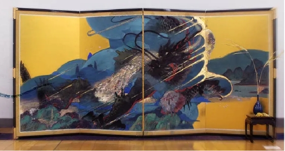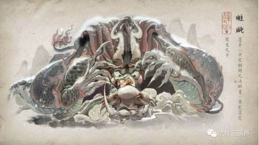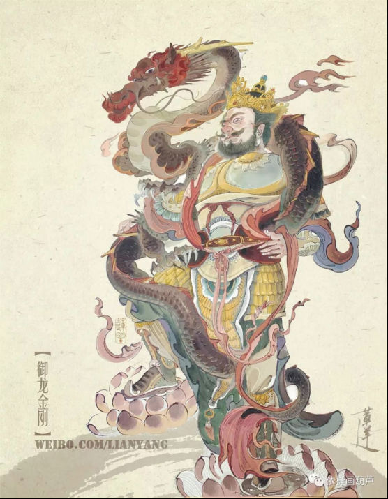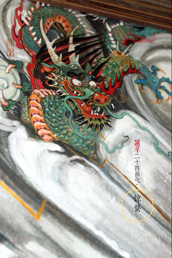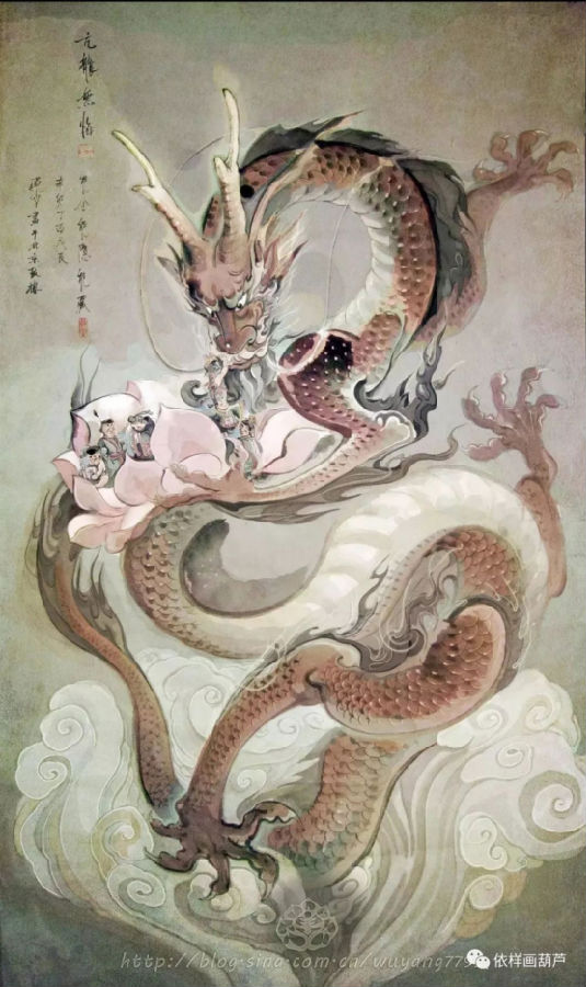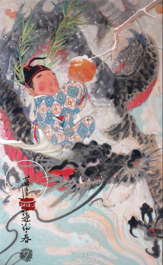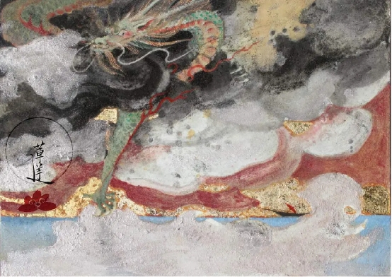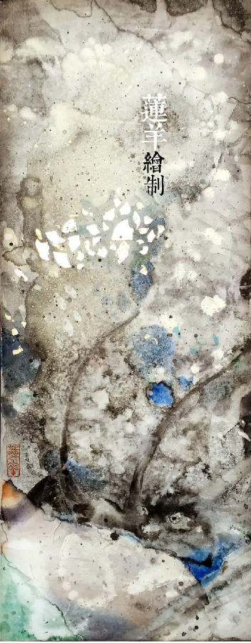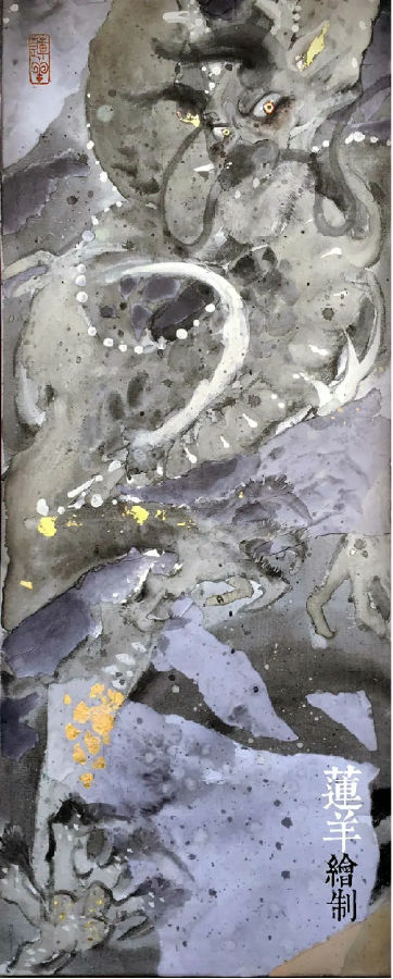 莲羊用岩彩画龙,